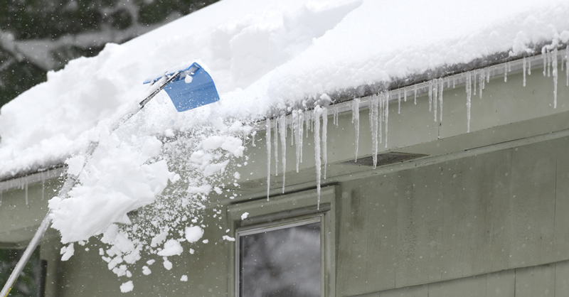 Snow removal tips: Be very careful when clearing snow and ice from your roof. If you’re clearing the roof yourself, work from the ground using a roof rake with a telescopic handle. Take care not to accidentally damage the roofing material and keep your tools well away from nearby hydro cables.